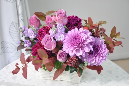 そのような情報をいただきましたので、アレンジメントは早稲田カラー、あずき色、いえ、えんじ色、或いはボルドーカラーともいう、、、、でまとめました。