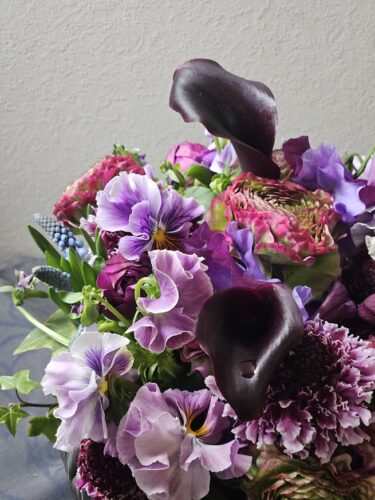 毎年お誕生日のお祝いのお花をご注文いただいている方への今年のフラワーギフトは 今が旬のフリフリのバイカラーパンジーなどを使って。