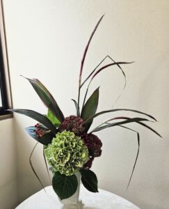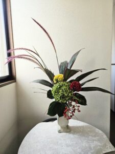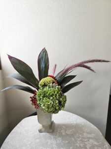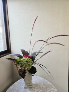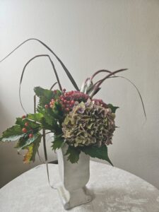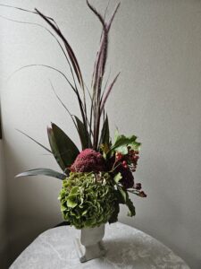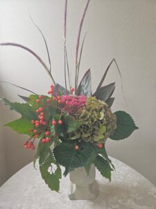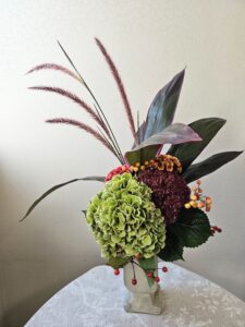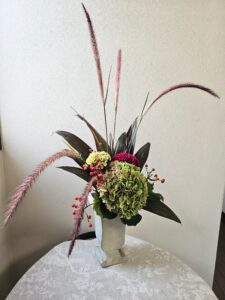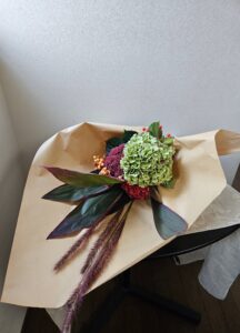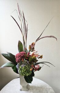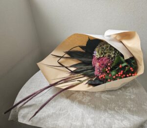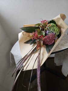 フランスで見かけるボルドー色の穂のある草と秋色紫陽花を入れた花束です。