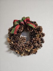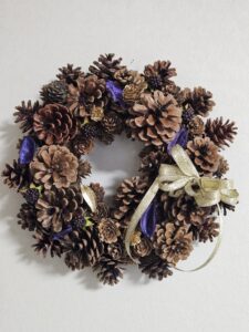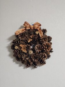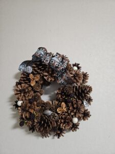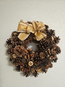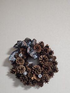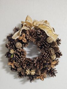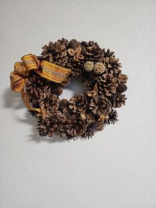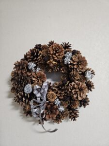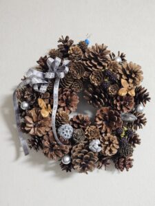 松かさ等の実を使ってリースを。リボンや色物のあしらいで生徒さんは個性を出しています。